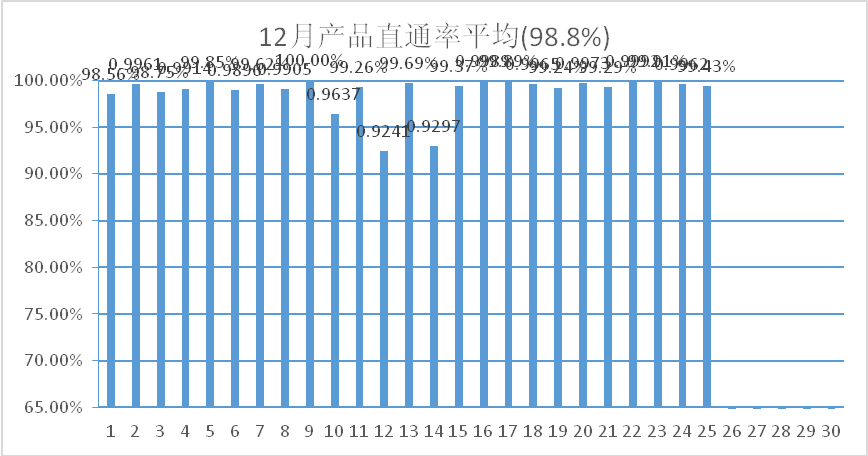 注塑質檢部結合生產部從各個細節(jié)入手,制定并落實了質量管控細則,重點關注提高工作效率、降低生產成本、提升產品質量等幾個方面,確保各項工作得到扎實穩(wěn)步推進。通過共同努力,12月份產品質量直通率較前11個月平均值(97.7%)提高了1.1個百分點,本年度12月份產品質量直通率達到98.8%。